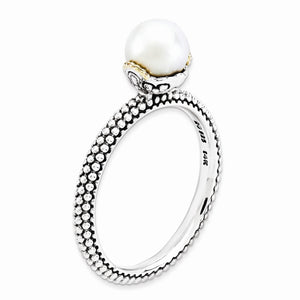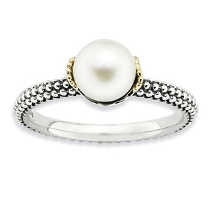 • A beautiful 7.-7. Mm freshwater cultured white pearl is prominently set on this 2. Mm antiqued milgrain band created from rhodium-plated sterling silver accented with 14k yellow gold. Wear it alone or featured in a collection. Guaranteed to fit together perfectly with all of our mix and match Stackable Expressions rings. Due to the nature of pearls, colors may not match what is shown. Gemstone treatment: bleached. This item is backordered. Please allow 7-10 business days for delivery