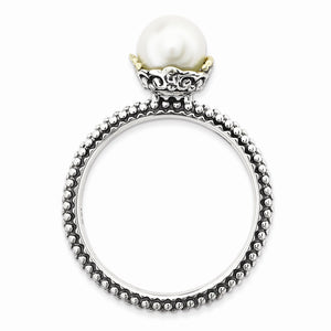 A beautiful 7.-7. Mm freshwater cultured white pearl is prominently set on this 2. Mm antiqued milgrain band created from rhodium-plated sterling silver accented with 14k yellow gold. Wear it alone or featured in a collection. Guaranteed to fit together perfectly with all of our mix and match Stackable Expressions rings. Due to the nature of pearls, colors may not match what is shown. Gemstone treatment: bleached.