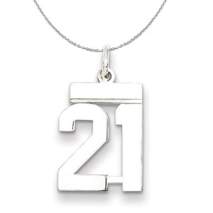 Celebrate your favorite sports player, lucky number or milestone date in your life with a prominent rhodium-plated sterling silver charm. Each polished number is approximately 13mm (1/2 Inch) in length, which is finished with a 2mm top bar and a classic jump ring that will accommodate up to a 3mm chain. Includes a 24 inch, 1.25mm sterling silver cable chain with a lobster clasp closure.