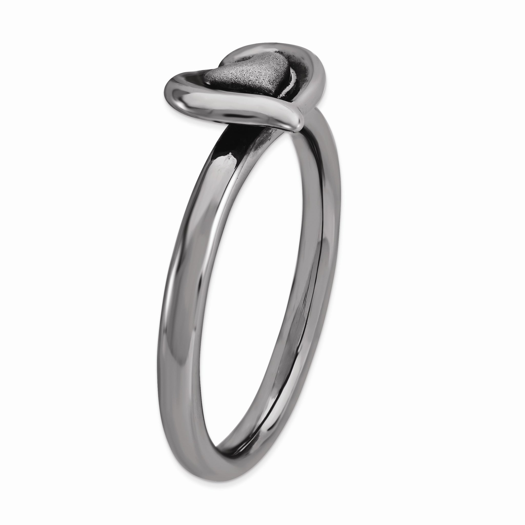 Create a look that is all your own with a fun assortment of rings that looks great alone or stacked in a collection to express your own unique style. This polished black ruthenium plated sterling silver ring features a 9mm asymmetrical heart with a satin center and a 2.5mm width band. Guaranteed to fit together perfectly with all of the mix and match Stackable Expressions rings. This item is backordered. Please allow 7-10 business days for delivery