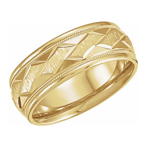 Category: *Style - Fancy 14K Yellow Gold 7.00 mm Band Design - Milgrain Engravable Finish - Brushed Fit Type - Comfort Made in USA Mens Size 10 Size 10.5 Size 11 Size 11.5 Size 12 Size 12.5 Size 13 Size 13.5 Size 4 Size 4.5 Size 5 Size 5.5 Size 6 Size 6.5 Size 7 Size 7.5 Size 8 Size 8.5 Size 9 Size 9.5 Unisex Wedding