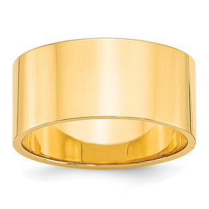 A sleek contemporary style band created in polished 10k yellow gold. This men's band features a flat profile, a standard fit shank, is approximately 1.2mm in thickness (lightweight), and 10mm in width. Wide bands fit tighter on the finger, so you might want to consider moving up a size for a more comfortable fit. Suitable for engraving. Made in the U.S.A.