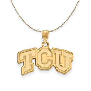 • If you are a fan of Texas Christian University and the Horned Frogs then you need to show your school spirit with this Texas Christian University pendant. We are a certified college jewelry retailer and this authentic item is officially licensed. It is crafted from 14k Yellow Gold and crafted by LogoArt in the USA. Includes a 24 inch, 0.8mm 14k yellow gold cable chain with a lobster clasp.