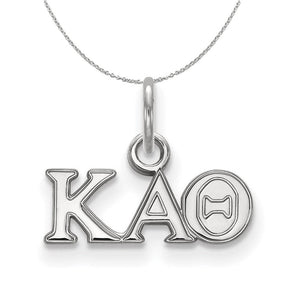 Show your greek life spirit with this Kappa Alpha Theta Sorority pendant necklace. It is crafted with rhodium plated sterling silver and without the bail is 7mm in height and 15mm in width (0.28 in x 0.59 in). With the bail, the measurements are 12mm in height and 15mm in width. We are a certified LogoArt retailer and this authentic item is licensed by the Kappa Alpha Theta Sorority and Greek Life. This pendant necklace is made the USA. Includes an 18 Inch, 1.25mm cable chain.