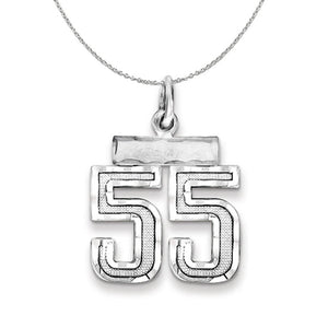 Celebrate your favorite sports player, lucky number or milestone date in your life with a prominent rhodium-plated sterling silver charm. Each satin and diamond cut number is approximately 12mm (7/16 Inch) in length, which is finished with a 3mm top bar and classic jump ring that will accommodate up to a 3mm chain. Includes a 1.25mm, 20 inch sterling silver cable chain.