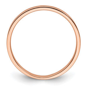 A sleek contemporary style band created in polished 14k rose gold. This solid band features a flat profile, a standard fit shank, is approximately 1.2mmin thickness (lightweight), and 2mm in width. Made in the U.S.A.