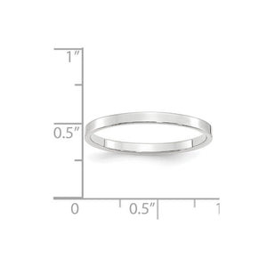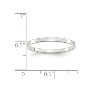 A sleek contemporary style band created in rhodium-plated 14k white gold with a polished finish. This solid band features a flat profile, a standard fit shank, is approximately 1.2mmin thickness (lightweight), and 2mm in width. ade in the U.S.A.