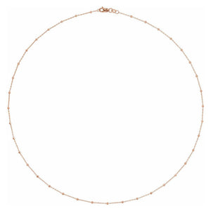 Cover all your bases with this fancy 14k rose gold necklace that features a delicate 0.85mm classic cable chain enhanced with 1.7mm faceted beads. It closes with a lobster claw clasp and is 18 inches in length.
