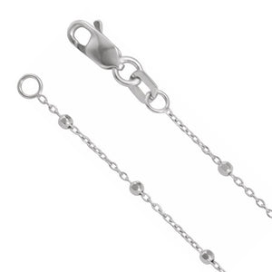 Cover all your bases with this fancy rhodium-plated 14k white gold necklace that features a delicate 0.85mm classic cable chain enhanced with 1.7mm faceted beads. It closes with a lobster claw clasp and is 18 inches in length.