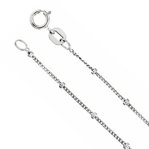 Cover all your bases with this fancy rhodium-plated 14k white gold 18-inch chain necklace that features a 1mm classic solid curb links enhanced with 1.9mm polished beads. It is finished with a 3.8mm jump ring and a 5.5mm spring ring clasp.