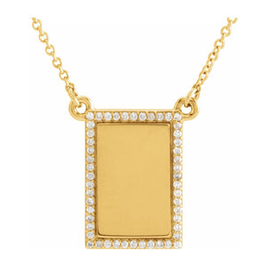 A simplistic yet elegant necklace design with a classic style featuring a vertical rectangle pendant set with 50 genuine diamonds totaling 1/8 carat and an 18-inch chain fashioned from 14k yellow, white, or rose gold. The pendant is approximately 15mm (9/16 inch) in width by 18mm (11/16 inch) in length and the attached 1mm solid cable chain is finished with a spring ring clasp. Each natural round diamond is I1 in clarity and G-H in color. Suitable for engraving. This is a made to order item and is estimated to ship 11/24/2025
