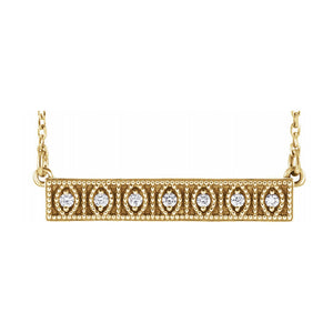A simplistic yet elegant 14k yellow gold necklace design with a contemporary style featuring a milgrain rectangular bar pendant set with genuine diamonds totaling 1/15 carat. The pendant is approximately 25mm (1 inch) in width by 5.5mm (1/4 inch) in length and the attached 1mm width, diamond-cut cable chain is finished with a spring ring clasp and adjustable in length from 16 to 18 inches. Each 1.3mm round diamond is I1 in clarity and G-H in color. This is a made to order item and is estimated to ship 11/27/2025