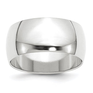 Sleek and simple with a classic half round design created from polished rhodium-plated 10k white gold. This standard fit band is approximately 8mm in width by 1.4mm in thickness (standard weight). Suitable for engraving.