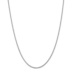 A traditional rhodium-plated 14k white gold rope chain measuring 2.25mm in width is handmade and closes with a lobster claw clasp. Its versatile, solid link design is ideal for men, women and children. 16 inches in length.