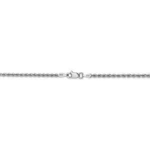 A traditional rhodium-plated 14k white gold rope chain measuring 2.25mm in width is handmade and closes with a lobster claw clasp. Its versatile, solid link design is ideal for men and women. 22 inches in length.