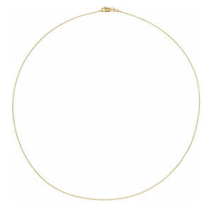 Simple traditional style, round open links of 18k yellow gold interlock to form a beautiful cable chain that sparkles and shines in the light thanks to the diamond-cut finish. This solid link, delicate necklace is approximately 1.0 mm in width, 20-inches in length and closes with a lobster claw clasp.