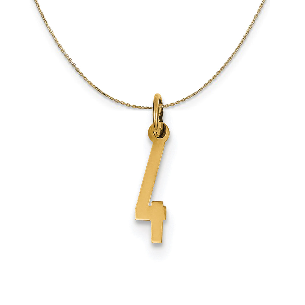 Celebrate your favorite sports player, lucky number or milestone date in your life with a prominent polished 14k yellow gold charm. This flat elongated number is approximately 4mm (3/16 inch) in width by 15mm (9/16 Inch) in length and is finished with a classic jump ring that will accommodate up to a 2mm chain. Includes a 18 inch long, 0.9mm wide, solid 14k yellow gold cable chain with a spring ring clasp.
