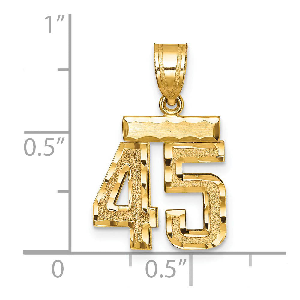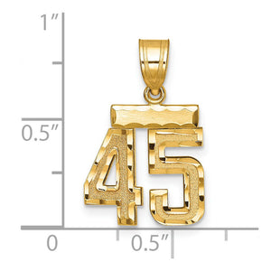 Celebrate your favorite sports player, lucky number or milestone date in your life with a prominent 14k yellow gold charm. Each satin and diamond cut number is approximately 12mm (7/16 Inch) in length, which is finished with a 3mm top bar and tapered bail giving it an overall length of approximately 26mm (1 Inch). Made in the U.S.A. Chain not included. This is a made to order item and is estimated to ship in about 10 days. Please email service@theblackbow.com for more details.
