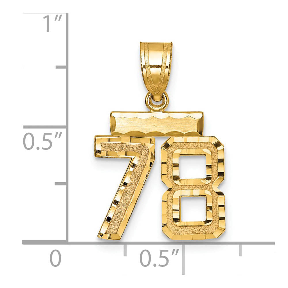 Celebrate your favorite sports player, lucky number or milestone date in your life with a prominent 14k yellow gold charm. Each satin and diamond cut number is approximately 12mm (7/16 Inch) in length, which is finished with a 3mm top bar and tapered bail giving it an overall length of approximately 26mm (1 Inch). Made in the U.S.A. Chain not included. This is a made to order item and is estimated to ship in about 10 days. Please email service@theblackbow.com for more details.