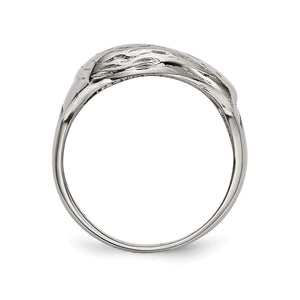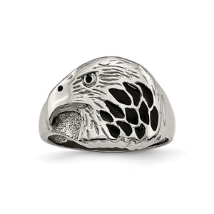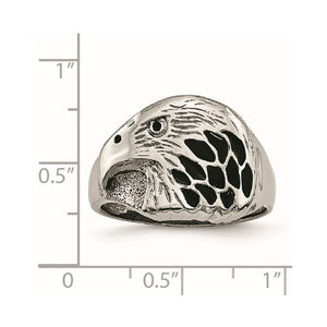• Rugged masculine style created from polished stainless steel and black enamel. This textured eagle ring is open on the back, approximately 15mm (9/16 inch) in width across the top and tapers to 4mm (3/16 inch) at the bottom of the band.
