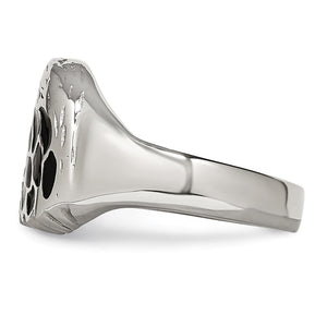 Rugged masculine style created from polished stainless steel and black enamel. This textured eagle ring is open on the back, approximately 15mm (9/16 inch) in width across the top and tapers to 4mm (3/16 inch) at the bottom of the band.