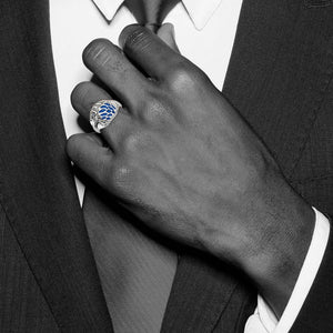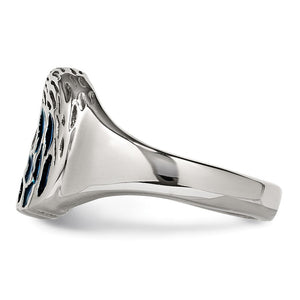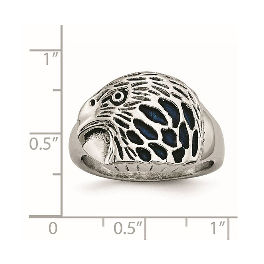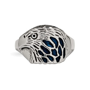 Rugged masculine style created from polished stainless steel and blue enamel. This textured eagle ring is open on the back, approximately 15mm (9/16 inch) in width across the top and tapers to 4mm (3/16 inch) at the bottom of the band.