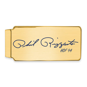 It is time to celebrate your favorite Hall of Fame baseball player, Phil Rizzuto! We are a certified retailer and this authentic signature money clip is officially licensed. It features a fold over design with a brushed finish that is created from 14k yellow gold plated sterling silver with navy blue epoxy. Epoxy colors may vary slightly. The color on your screen may also not reflect actual color due to variations in monitors and browsers. The approximate size is 24mm (15/16 inch) in width by 53mm (2 inches) in length. Made in the U.S.A. This item is not currently in-stock. Once you place your order, please allow us 5 to 7 business days to make it for you.
