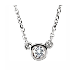 • Always a favorite! A gorgeous round genuine diamond is bezel set in rhodium-plated 14k white gold. The 1/3 carat natural diamond is 4.3mm in size, I1 in clarity and G-H in color. Multiple size options are available. The attached solid diamond-cut cable chain is 1mm in width, 18-inches in length and closes with a spring ring clasp.