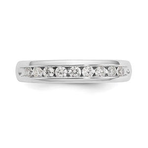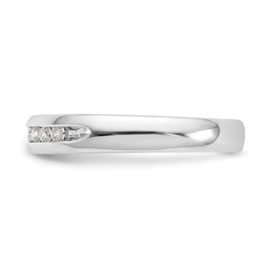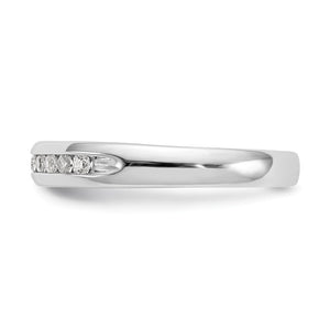 A simple but elegant style, this polished 3mm width tapered band is meticulously crafted from rhodium-plated 14k white gold and channel set with 9 round white diamonds. The natural diamonds are 1. Mm in size, I1 in clarity, G-H in color and the total diamond weight is 1/8 carat.