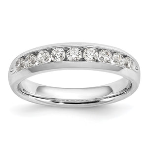 • A simple but elegant style, this polished 4. Mm width tapered band is meticulously crafted from rhodium-plated 14k white gold and channel set with 9 round lab-created diamonds. The lab-created diamonds are 2. Mm in size, VS2-SI1 in clarity, G-H in color and the total diamond weight is 1/2 carat.