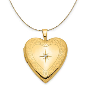 Show off your loved ones and keep them close with this 20mm heart locket fashioned from 14k yellow gold featuring a textured swirl border with a center diamond star design. Opens to hold two small photos or keepsakes. Prong set diamond is I2 in clarity, I-J in color and weighs .01 carat. Includes a 16 inch long, 0.9mm wide, solid 14k yellow gold cable chain with a spring ring clasp.