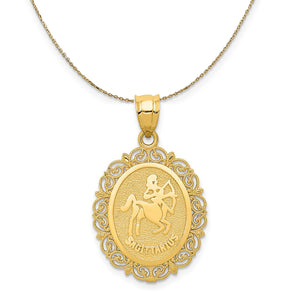 Sagittarius zodiac sign, the Archer. The Centaur, teacher of wisdom, rides through the sky with his bow, arrow, and quiver. This 17 x 20mm (5/8 Inch x 3/4 Inch) oval pendant features a polished raised relief and textured satin design created from 14k yellow gold. It has a textured back, which is not suitable for engraving and with the tapered bail is approximately 27mm (1 1/16 inch) in length. The pendant is . Includes a 30 Inch, 0.8mm 14k yellow gold cable chain with a lobster clasp.