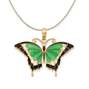 • Symbolic of change, elegance, growth, transformation, and more, the butterfly is a treasure trove of good omens. This stained glass style pendant fashioned from 14k yellow gold and acrylic is approximately 30mm (1 1/8 Inch) in width by 25mm (1 Inch) in length, which includes the tapered bail. Includes a 18 inch long, 0.9mm wide, solid 14k yellow gold cable chain with a spring ring clasp.