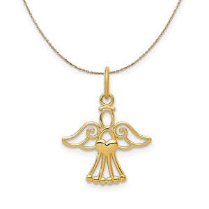 This small angel with heart pendant is crafted with 14k yellow gold and it features a polished finish. The approximate size is 15 mm x 19 mm and its average item weight is 0.46 grams. Includes a 18 inch long, 0.9mm wide, solid 14k yellow gold cable chain with a spring ring clasp.