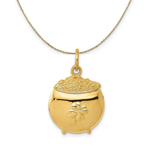 Tie the meaning to the moment with a classic or unusual pendant that makes it personal, thoughtful, or meaningful. This pot of gold charm crafted in 14k yellow gold features a polished finish with a textured back. The approximate size is 15mm (9/16 inch) in width by 23mm (7/8 inch) in length with the jump ring. Includes a 18 inch long, 0.9mm wide, solid 14k yellow gold cable chain with a spring ring clasp.