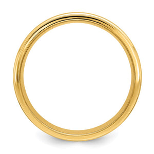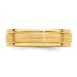 Distinctive style featuring a brushed and polished finish, grooved center and edges, plus a comfort fit shank designed from solid 14k yellow gold. This men's band is approximately 6mm in width and 1.35mm in thickness (light weight). Suitable for engraving.