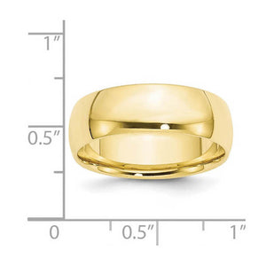 A traditional band created from 10k yellow gold featuring a classic dome design with a polished finish and a comfort fit shank. It is approximately 1.4mm in thickness (light weight) and 8mm in width. Suitable for engraving.