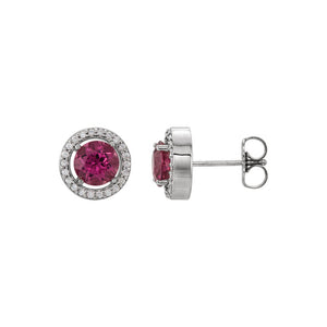 8mm Halo Style Pink Tourmaline & Diamond Earrings in 14k White Gold