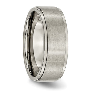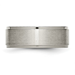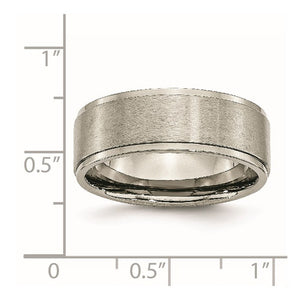 A timeless, traditional ring created from titanium combines a beautiful look with a sporty touch. This 8mm width band features a brushed flat center with polished, ridged edges. Because it is also hypoallergenic, it is ideal as a wedding band or fashion ring. Available in whole and half sizes 6-15.