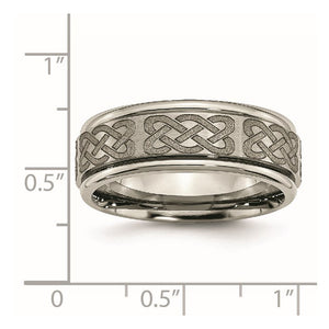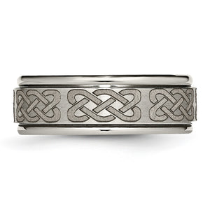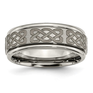 Refine your style with a distinctive ring crafted from titanium that mirrors your unique personality. This 8mm width flat band features a laser etched Celtic design with a brushed center, polished grooved edges, and a standard fit shank. Suitable for engraving.