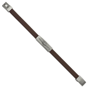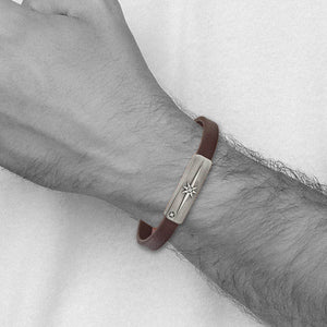 Simple and classic, this men's 8 inch bracelet crafted from white-bronze plated stainless steel and brown leather features an antiqued north star ID plate accented with 2 white cubic zirconia gemstones. The center plate is approximately 41mm (1 5/8 inch) long by 10mm (3/8 inch) wide. The 9mm (3/8 inch) width bracelet closes with a magnetic clasp. Not suitable for engraving.