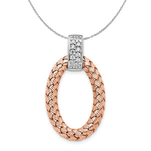 A classic braided pendant beautifully detailed with a textured oval design fashioned from rose gold tone and rhodium plated sterling silver with cubic zirconia gemstones. It measures approximately 3.75mm in thickness, 17mm (5/8 inch) in width by 30mm (1 3/16 inch) in length, which includes the bail. Made in Italy Includes a 1.25mm, 18 inch sterling silver cable chain.