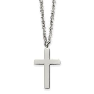 Celebrate and honor all special occasions with jewelry of religious significance! Our collection of spiritually inspired designs that show faith, hope and devotion are perfect for commemorating life's milestones. This women's stainless steel necklace features a polished cross pendant that is approximately 16mm (5/8 inch) in width by 25mm (1 inch) in length, bail not included. It hangs on a 1.5mm width by 18-inch-long cable chain that closes with a fancy lobster clasp.