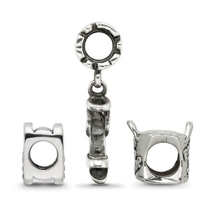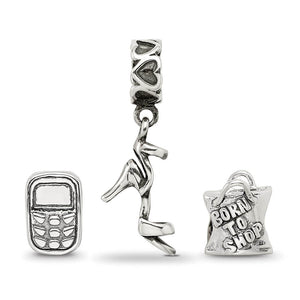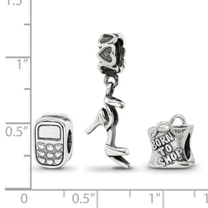 Personalize your bead collection with a set of theme beads designed to reveal your true passion. This antiqued sterling silver 3 charm set includes a 10 x 7mm cell phone, a high heel dangle charm and a 10 x 8mm born to shop bag. All three charms feature a 4mm bead hole that is interchangeable as well as compatible with Reflections and other popular 3mm width bead style bracelets and necklaces.