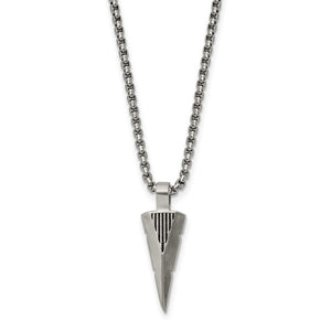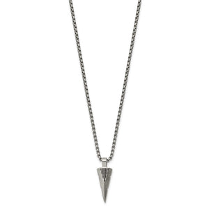 Add a unique focal point to a classic outfit with this small arrowhead necklace fashioned from brushed and polished stainless steel. The pendant is approximately 9mm (3/8 inch) in width by 27mm (1 1/16 Inch) in length, which includes the bail. It hangs on a 2mm width, 22-inch long rounded box chain that closes with a fancy lobster clasp.