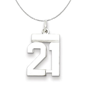 Celebrate your favorite sports player, lucky number or milestone date in your life with a prominent rhodium-plated sterling silver charm. Each polished number is approximately 16mm (5/8 inch) in length, which is finished with a 2mm top bar and a classic jump ring that will accommodate up to a 3mm chain. Includes a 1.25mm, 20 inch sterling silver cable chain.