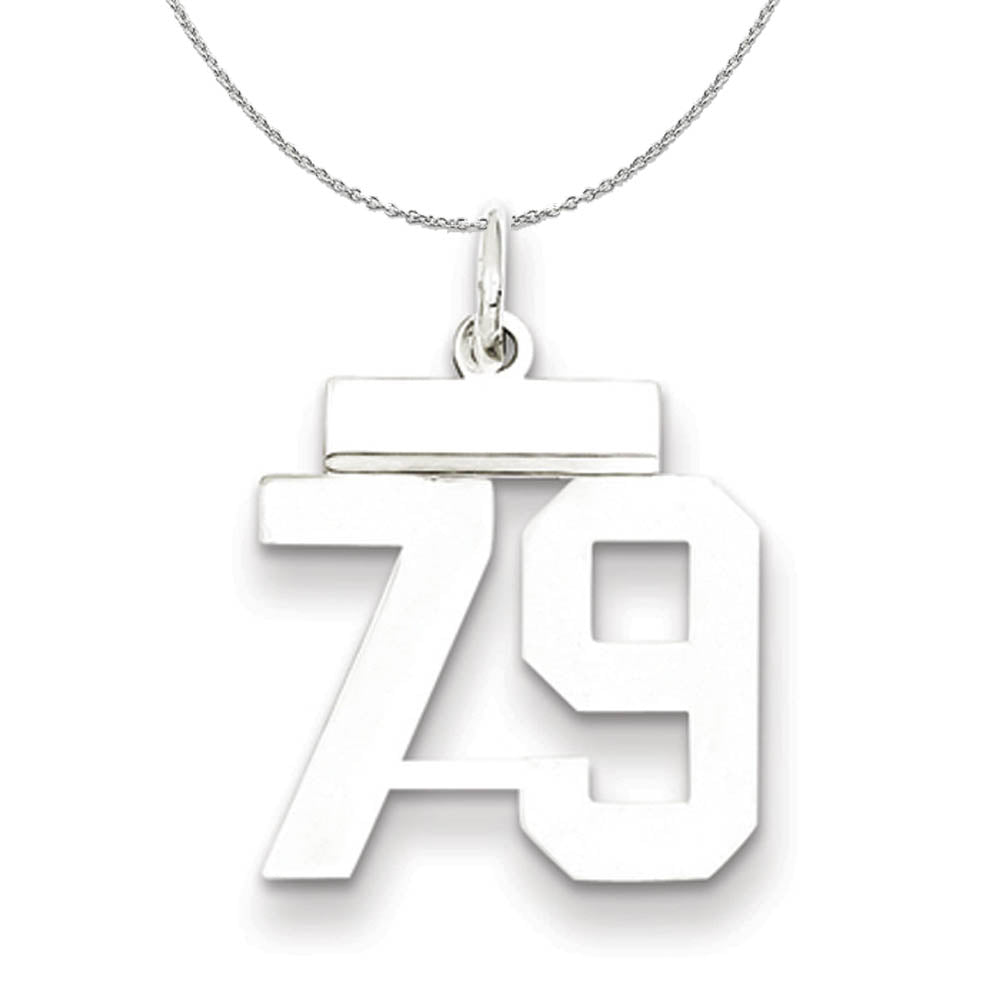 Celebrate your favorite sports player, lucky number or milestone date in your life with a prominent rhodium-plated sterling silver charm. Each polished number is approximately 13mm (1/2 Inch) in length, which is finished with a 2mm top bar and a classic jump ring that will accommodate up to a 3mm chain. Includes an 18 inch, 1.25mm sterling silver cable chain with a lobster clasp closure.