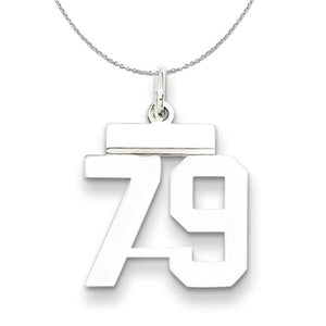 Celebrate your favorite sports player, lucky number or milestone date in your life with a prominent rhodium-plated sterling silver charm. Each polished number is approximately 13mm (1/2 Inch) in length, which is finished with a 2mm top bar and a classic jump ring that will accommodate up to a 3mm chain. Includes a 24 inch, 1.25mm sterling silver cable chain with a lobster clasp closure.