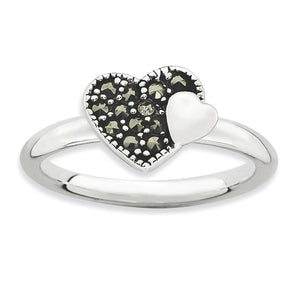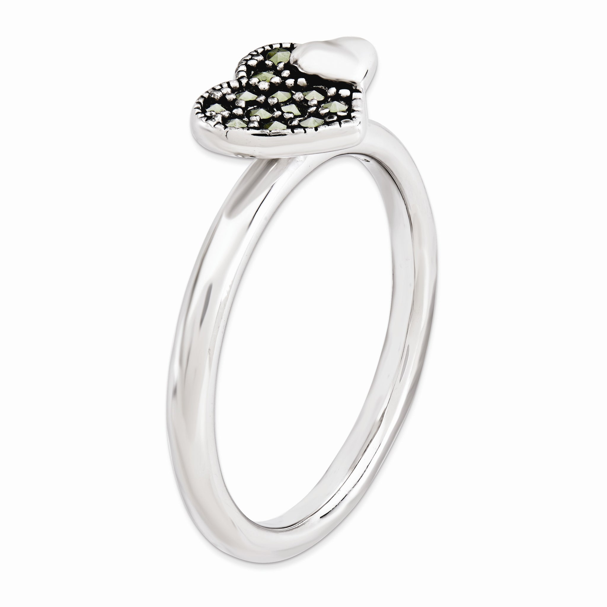 Fun and whimsical, appealing to all ages and can be worn alone or featured in a collection. This 2.5mm rhodium plated sterling silver band features an 11mm heart accented with 12 sparkling marcasite stones. Guaranteed to fit together perfectly with all of the mix and match Stackable Expressions rings.