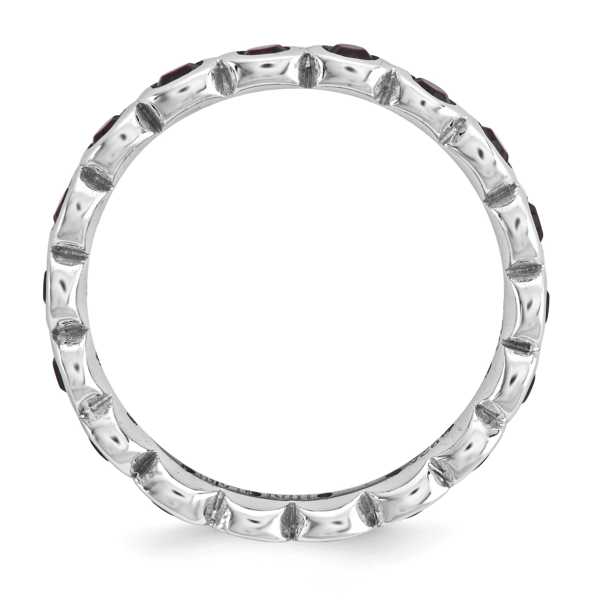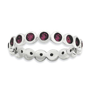 Use this simulated birthstone ring to symbolize an important month or use multiples to create a personalized family combination. Representing the month of June, this 3. Mm wide band fashioned from rhodium plated sterling silver is bezel set with purple/red crystals all the way around. Guaranteed to fit together perfectly with all of the mix and match Stackable Expressions rings.